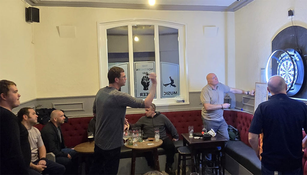 The best finish came from Jerry Burke (Clarry B) with 116 whilst James Murray (Runcorn Linnets) had a 106. Anton Conroy (Bogey Flickers) had a 104 finish with Chris Hough (in doubles) hitting a 102 for The Willies. Paul Lawson had a 100 checkout for Clarry Tats. There were also some good double starts in doubles games this week, with Gary Chaffe (Castle Double Tops) hitting a 160 start and Glyn Mason (Halfway Peers) getting away with a 152.